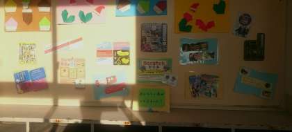 図書室のろう下に学校図書館補助員の清村先生が、新しい本の紹介を貼り出してくださいました。