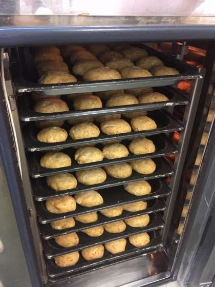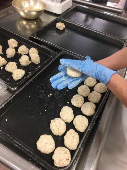 ツナ缶、片栗粉、玉ねぎ、豆腐、砂糖、塩、こいくちしょうゆを練るように混ぜて、1人1個ずつなるように形を作り、オーブンで焼いて作ります。今日は、320個作るため、材料を混ぜあわせた後、ボールに小分けしてから形づくりをします。食べるときに、ケチャップをかけて頂きます。