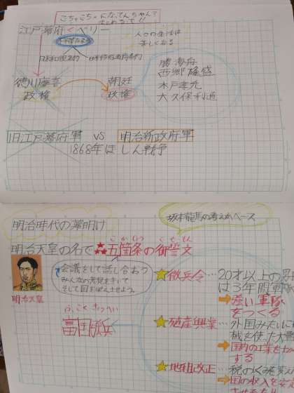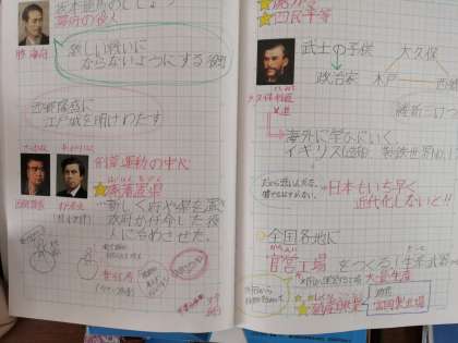 シールや色鉛筆を効果的に使いながら、高学年らしいすっきりとしたノートまとめができています。