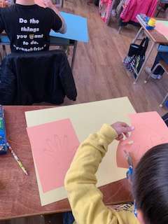 切り取ったかわいい手のひらの型を画用紙に貼っていきました。