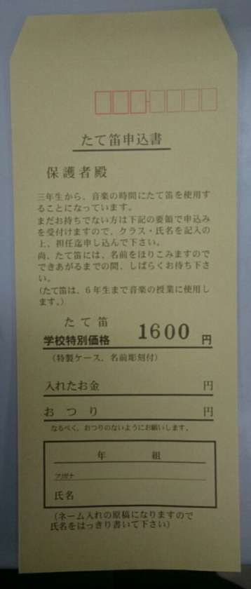 19日(火)に、お子さんがリコーダー購入申込の封筒を持ち帰っています。