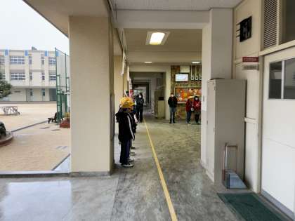 最終日の今日はあいにくの雨で、正門をくぐった廊下で並んで行いましたが、
