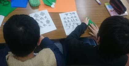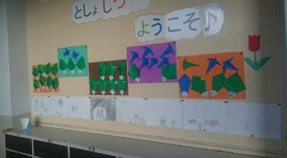 2月の掲示物として、かぶとツバメを折り紙で作りました。