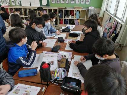 4つの場面を班のメンバーで担当を振り分け、その場面を選んだメンバー同士で話し合いました。話し合った後に、班に持ち寄りまとめる。所謂、ジグソー法に挑戦しました。