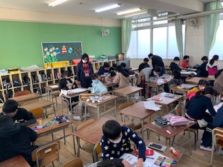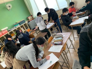 ポスターを作成しています。2人〜3人組で真剣に作っています。