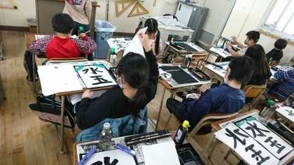 3年生から始まった毛筆の学習、1年たって準備や片付けも早く、とめやはらい等に気を付けて書き、筆の扱い方が上手になりました。