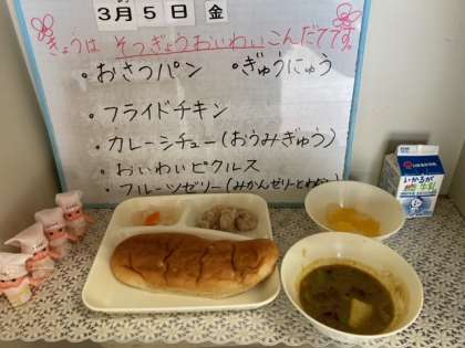 いつもより一品おかずが多く、人気メニューのフライドチキン、カレーシチューはもとより、新メニューのフルーツゼリーも大好評でした。