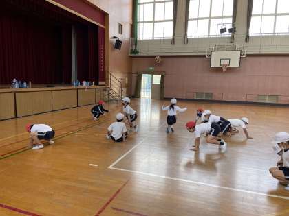 体育科では、マット運動以外にも、いろんな動物になりきって行う「動物散歩」をしました。