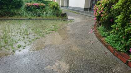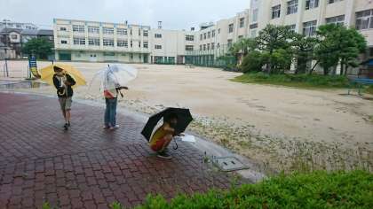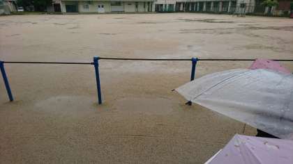 梅雨の今、降ってきた雨は運動場でどうなっているのでしょうか。どこからどこへ流れているのでしょうか。