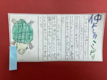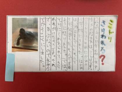 4年国語で学校のニュースを取材しています。なかよしのかめのミドリがこのたび取材を受けました。
