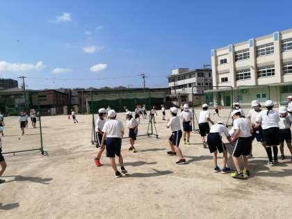 入念な準備体操と、玉入れの玉と防球ネットを使い、体重移動や手首や腕を大きく振ること、そして45度に投げる練習をしてから行いました。