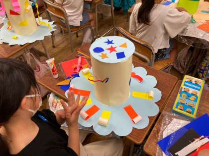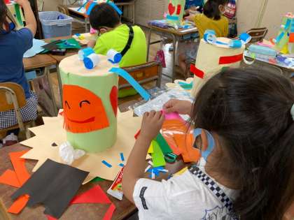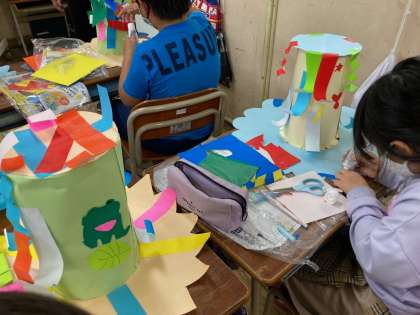 この間、チョキチョキと切っていたものが仕上がってきました。今日は、先週切ったものに、折り紙を折ったり、切ったりして貼りました。子どもたちは、工夫して作り上げていっています。さぁ、来週は仕上げです。どんな作品ができるか、楽しみです。
