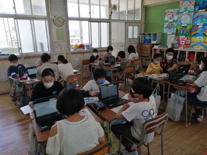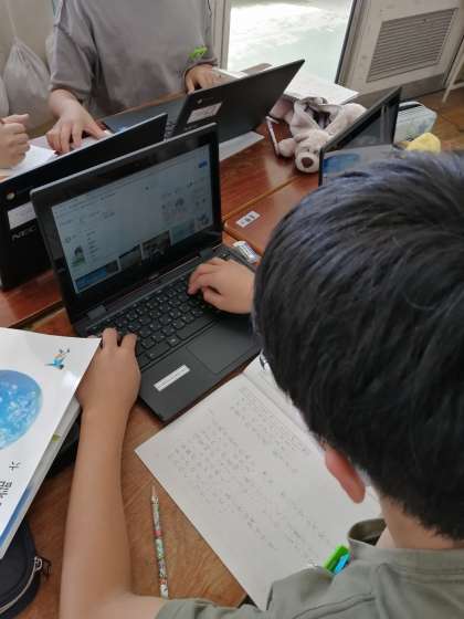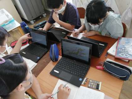 一人一台端末を活用して、各々の班のテーマに沿って、防災ポスターをつくっています。