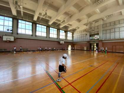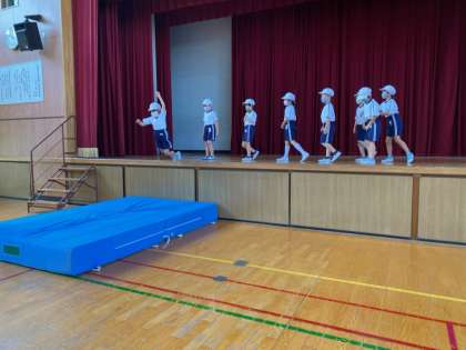 今日は、サーキット運動を講堂で行いました。舞台の上からジャンプ!最初は両手をついて、着地をしている子もいましたが、だんだんと、手をつかわずに着地できるようになりました。前回りも頑張っています。