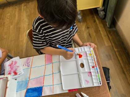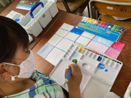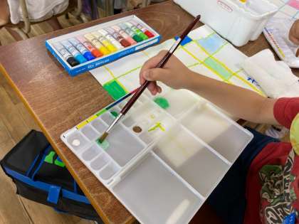 色が変わった様子に、「エメラルドグリーン!」「水色!」「ピンクなった!」などと、あちらこちらで終始感動の嵐でした。最後は、二色の絵の具を混ぜました。いろんな発見があった絵の具の時間でした。
