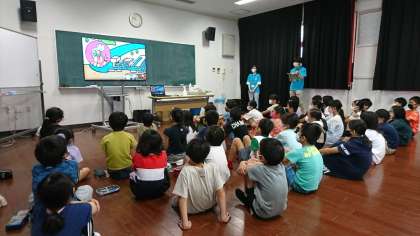 「わたしたちのくらしと水」の学習を終えた4年生、浄水場見学に行けなかったので、水道局からたくさんの実験器具をもって授業をしに来てくださいました。