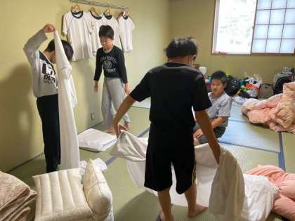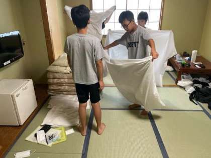 部屋の全員が起き、ていねいに布団を片付けています。