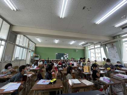 夏休み中がんばった宿題をみんなの前で見せ、発表している様子です。