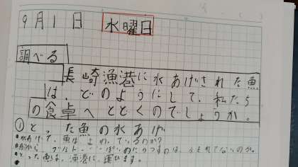 社会科の授業では、長崎漁港に水あげされた魚は、どのように私たちの食卓へ届くのかについて学習しました。スーパーマーケットまでの届く過程を確認し、それぞれで、自分の一番気になる過程を調べました。調べたものを発表しあい、スーパーマーケットに届くまでの過程のそれぞれを深めていきました。最後は、スーパーマーケットに届くまでにどのような人たちが関わって届くのかをまとめました。