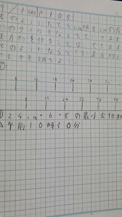 算数の授業では、公倍数を使って「長方形のタイルを正方形には何枚タイルを重ねればよいか」を考えました。一人では「どうしたらいいのかな?」と困っていた子どもたちも、友だちと考えたりみんなで考えたりすることで、問題ができるようになっていきました。できるようになってからは、どんどん問題をこなしていきます。教科書だけでは全然足らず、計算スキル、わくわく算数、教科書のもっと練習と、たくさんの問題に取り組むことができました。