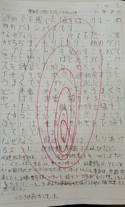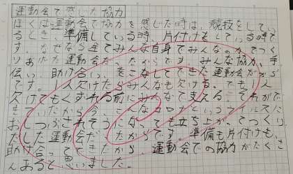 作文では、運動会でかんがえた協力に対する子どもたちの考えがたくさんみられました。