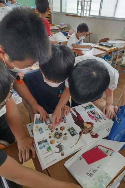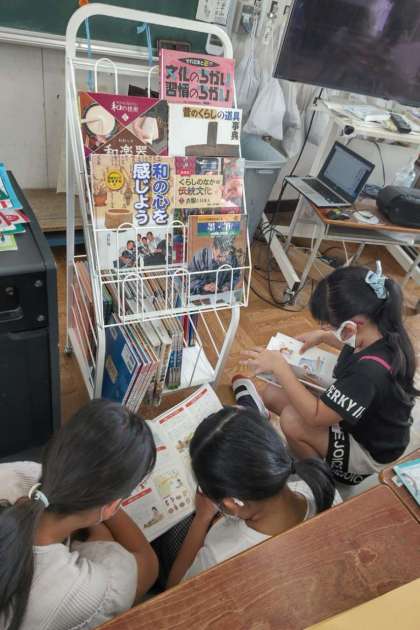 写真は授業で本を紹介した後、休み時間の様子です。