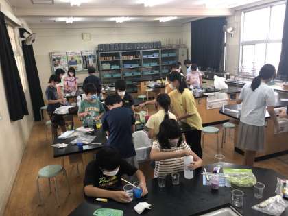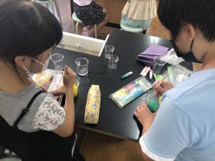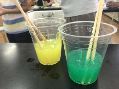 お気に入りの色の絵の具を混ぜれば、自分の好きな色のスライムをつくることができます。