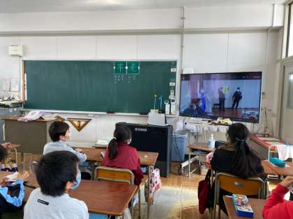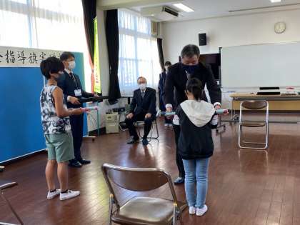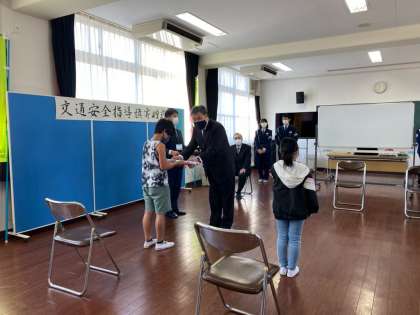 PTAの保護者の方に毎朝黄色の旗を持って立って頂いていますが、その旗が新しくなります。代表で4年生の児童が、警察の方から受け取りました。