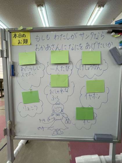 土曜日での参観では、話し合いをしました。今回のテーマは「もし自分がサンタになったらお母さんに何をあげるか」でした。みんなそれぞれじっくり考えていました。化粧品、おしゃれな服、旅行などお母さんの喜びそうなものを考えることができました。