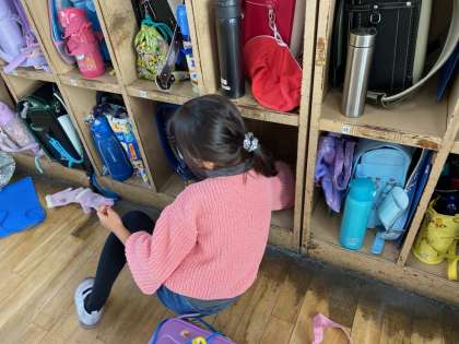 椅子や机のあし、ロッカー、下駄箱を「ありがとう」の気持ちを込めて拭くと、子どもたちは自然と笑顔になっていました。