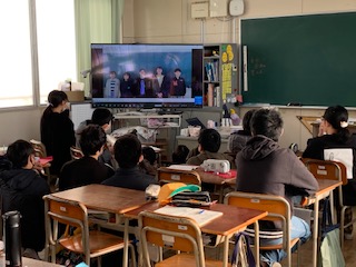 パソコン係が旅行中に撮りためた写真を使用して、報告集会担当係が大型テレビを通して他学年児童に報告を行いました。