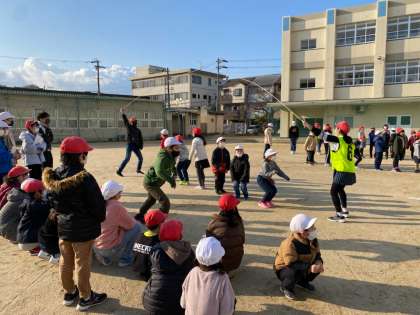 六年生が大きく縄を回し、1〜5年生は声を出しながら高く跳んでいます。