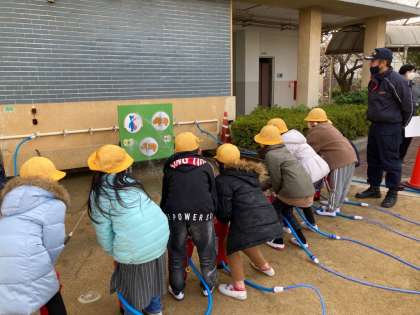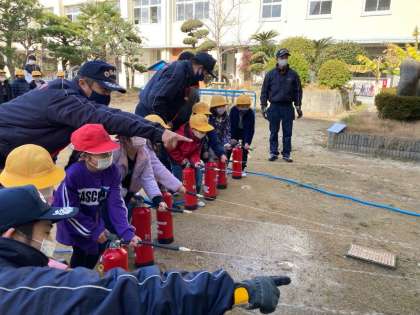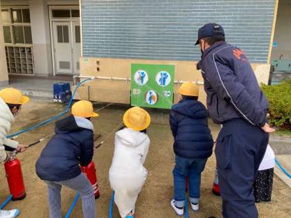 1〜3年生は消火器の使い方を教えてもらいました。自分たちで消火器を使うときは、火が自分の身長よりも小さいときに使うことを知りました。水を的に当てられるように、頑張りました。