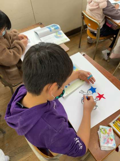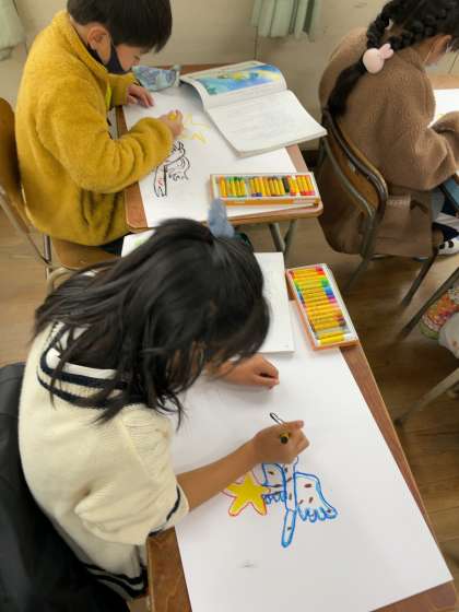 児童によって選ぶ場面、文章から想像を広げて描いた形や色が異なります。