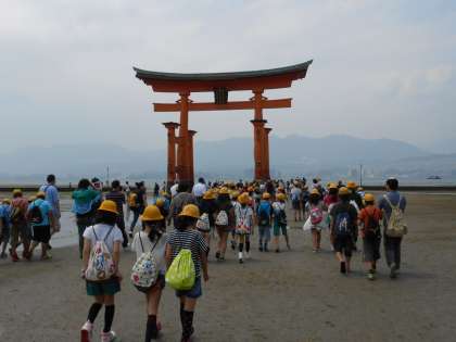 楽しみにしていた修学旅行がスタート、実行委員会の委員さん中心に出発式をしました。新幹線・松大汽船を乗り継いで、宮島に入り、世界遺産に登録されている厳島神社やリニューアルされた宮島水族館の見学をしました。干潮のため、海に浮かぶ厳島神社を見ることはできませんでしたが、大鳥居まで行くことができ磯の生物にも触れることができました。