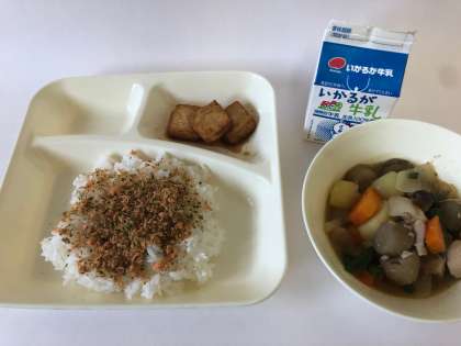 今日は、ごはん・牛乳・鶏肉とじゃがいもの煮もの・あつあげのしょうゆだれかけ・紅ざけそぼろでした。