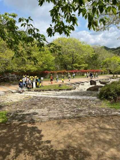 福島大池を越えてから、グループで協力してクイズに挑戦しています!