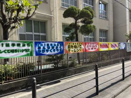 各学級のクラス目標を学校北側のフェンス沿いに掲示しました。各学年クラスの子どもたちが一年をかけて目指していく目標です。どの学年クラスともに立派な目標をたてています。参観など学校へお立ち寄りの際には、ぜひ、見てください。
