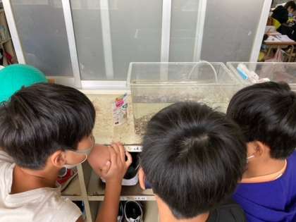 理科の学習で教室にメダカがやって来ました。みんな、かわいーと言いながら、観察しています。