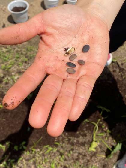 そして、種を実際に触り特徴を掴んだら、絵を描いたり、植木鉢には、すくすく育つように心を込めて自分の名前などを書きました!