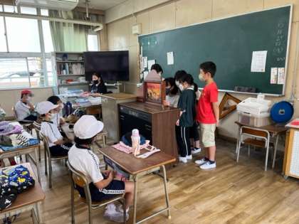今週は読書週間です。図書委員が低学年のクラスに読み聞かせに来ています。低学年のみんなは、お兄さんお姉さんが読んでくれる紙芝居に夢中になっていました。