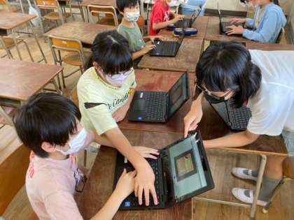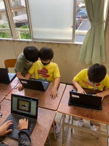 最初にタイピング練習をして、その後、プログラミングに取り組みます。グループの中でパソコン操作が得意な人が、慣れてない人に教えています。