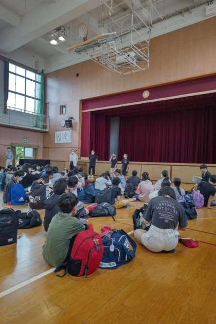 雨なので講堂で出発式です。