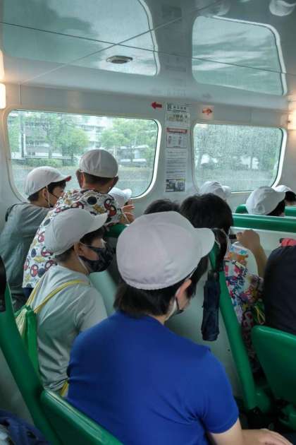 世界遺産航路をながめる子、疲れて寝てしまっている子など船内での様子は色々でしたが、どの子も船酔いすることなく平和公園に到着できました。