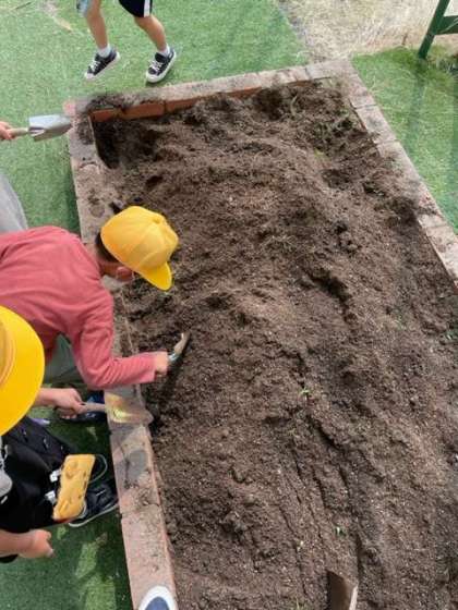 1年生の花壇にひまわりとオクラのたねを植えよう、という提案から始まった授業。