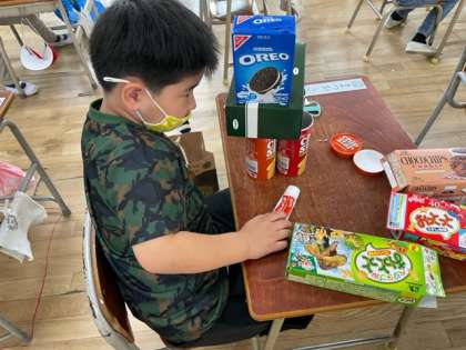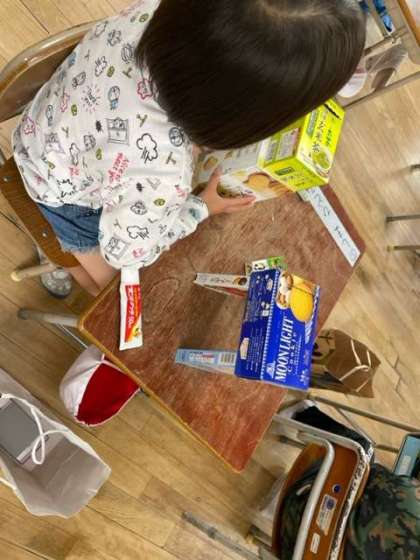ご家庭から持ってきた箱を使い動物を作りました。長い箱をキリンの首に見立てたり、大きい四角の箱は胴体に見立てたりしました。