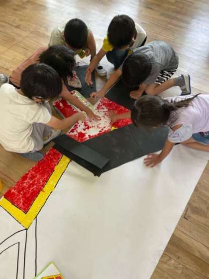 宝箱の淵は黄色の折り紙をちぎり糊で貼り、赤色のところは指に絵の具をつけてペタペタスタンプしました。