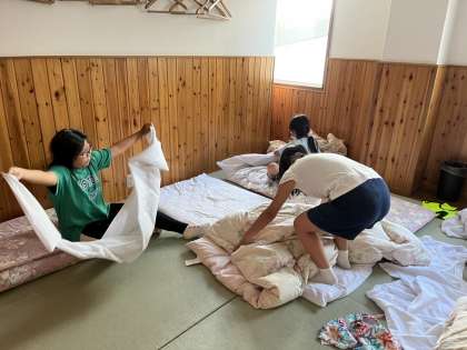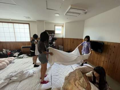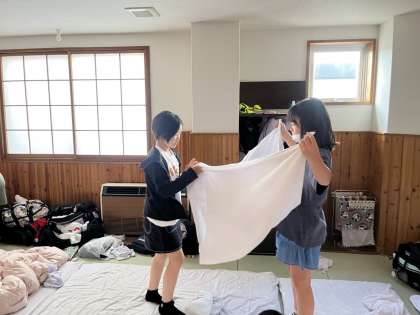 昨日より少し疲れが見えますが子どもたちは元気です。起床して朝の準備をし、協力してシーツや布団を片付けています。