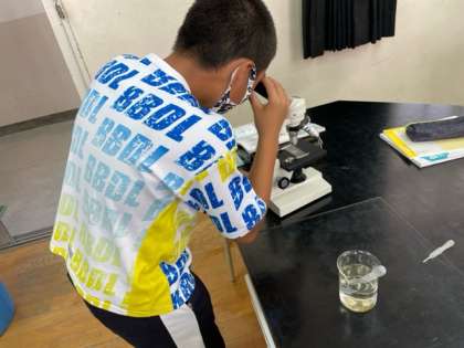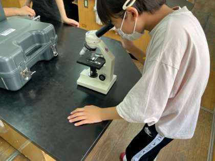 ビーカーで池の水をすくい、顕微鏡で池にいる目には見えない小さな生物を見つけることができました!