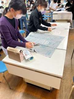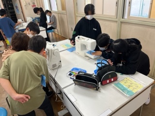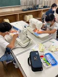 エプロンを型紙に合わせて裁ちばさみできりました。その後練習布を使って、ミシンの使い方を学習しました。